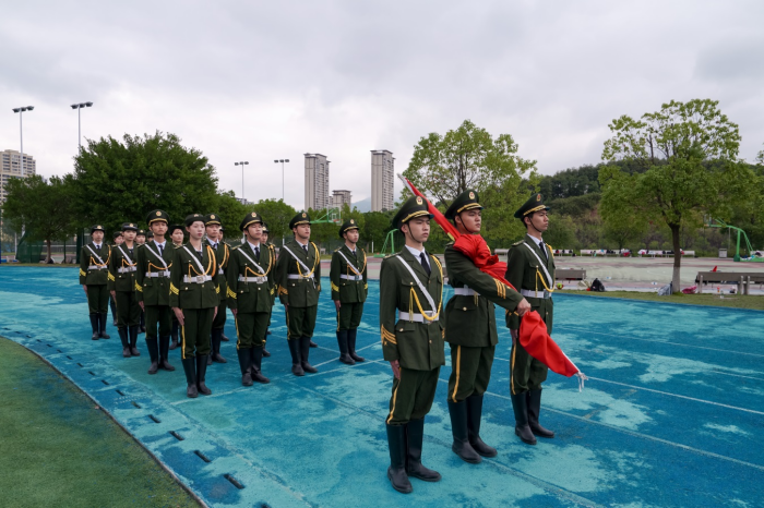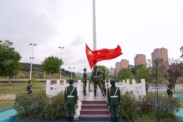 国旗队英姿飒爽,步伐铿锵,护卫着五星红旗走向升旗台。随着雄壮的国歌声响起,鲜艳的五星红旗冉冉升起,迎风飘扬。师生们全体肃立,精神抖擞,注目国旗,向伟大祖国致以崇高敬意。