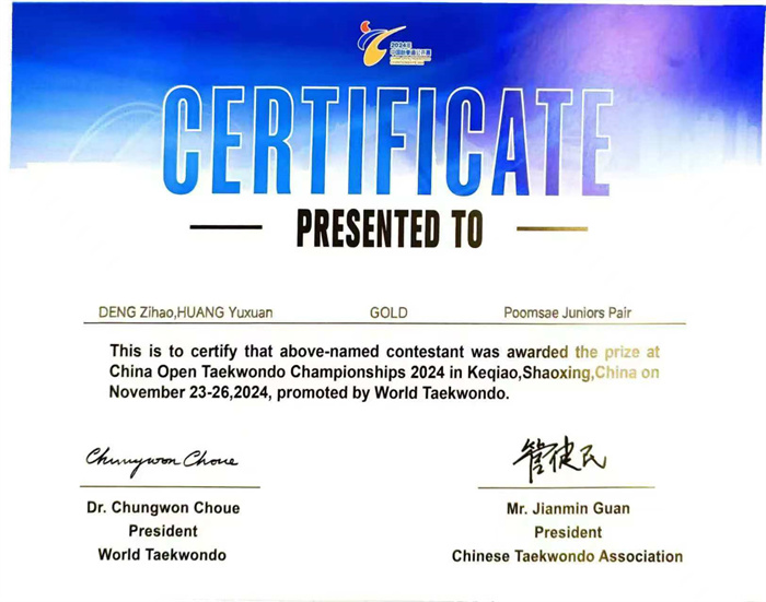 我校运动员邓梓皓代表福建省跆拳道协会参加比赛。在比赛中不畏强手、敢打敢拼、勇于拼搏、顽强奋战,最终获得青年组混双品势冠军、青年组男子个人品势季军。