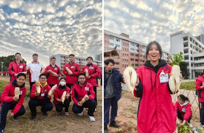 2023年段1500余名师生历经三个月的共同呵护与精心管理,迎来了丰收的季节。从最初的翻土、播种,到日常的浇水、施肥,每一步都凝聚了23年段同学们的心血与汗水。他们亲眼见证了萝卜从一粒种子到硕果累累的成长历程,深刻体验了劳动的艰辛与收获的喜悦。